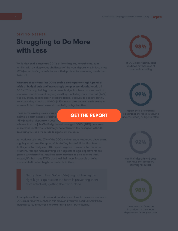 What are these front-line DGCs seeing and experiencing? A parallel crisis of budget cuts and increasingly complex workloads. Nearly all DGCs (98%) say their legal department budget has been cut as a result of economic conditions and ongoing volatility—including more than half (56%) who say the budget has been cut a great deal. But even as budgets shrink, workloads rise; virtually all DGCs (99%) report their department is seeing an increase in both the volume and complexity of legal matters.
