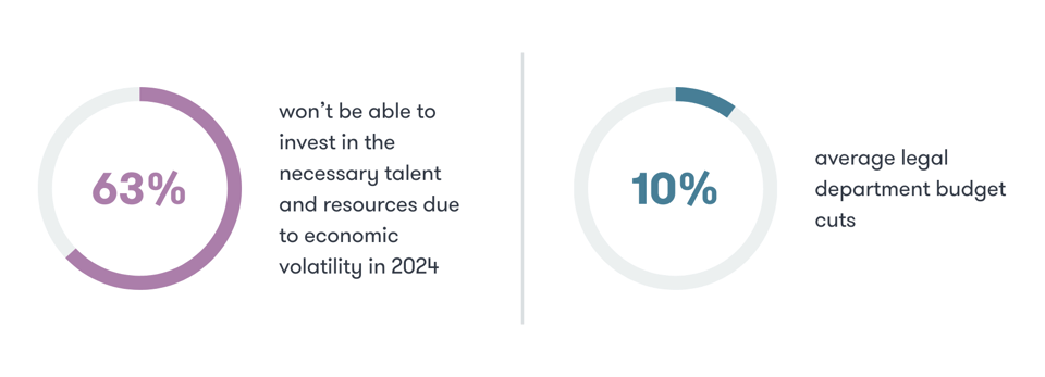 As economic volatility continues to loom in 2024, 63% of SMB GCs and legal leaders are grappling with concerns about their legal departments' capacity to invest in the necessary talent and resources, a challenge exacerbated by an average 10% reduction in legal department budgets due to current and anticipated economic conditions. Small to mid-size businesses in particular are feeling the squeeze of these budget constraints, necessitating a strategic and forward-thinking approach to resource allocation.