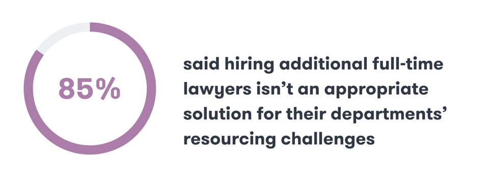 The notion of hiring additional full-time lawyers to address resourcing gaps is met with skepticism by 85% of SMB GCs (8% higher than enterprise counterparts) due to the inherent difficulties in recruitment and the potential for turnover or hiring freezes. The call for innovative, adaptive solutions that align with the evolving needs of legal departments has never been clearer.