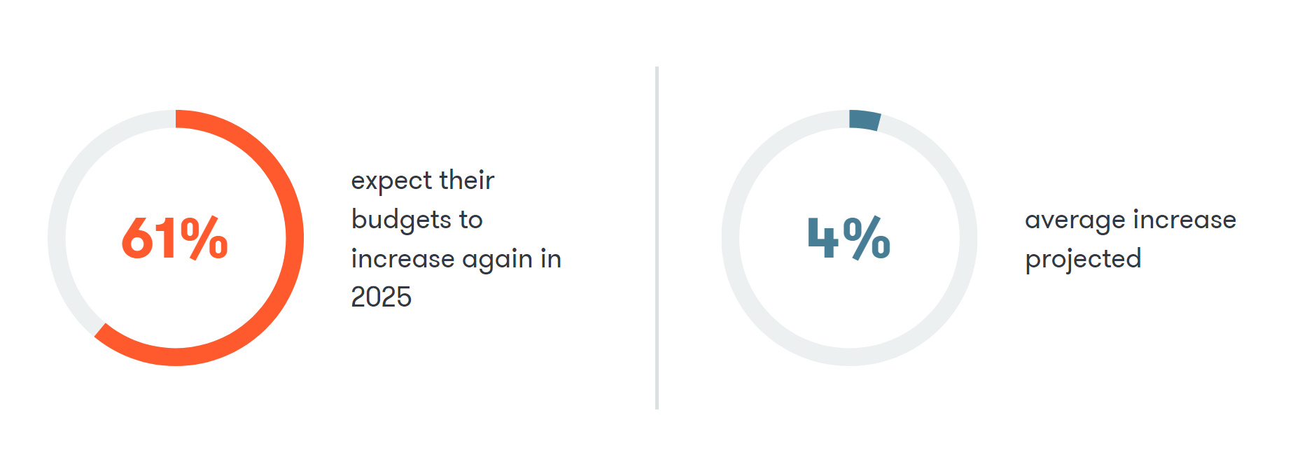 - Looking ahead to 2025, 61% of GCs expect their budgets to increase again, projecting another average increase of 4%