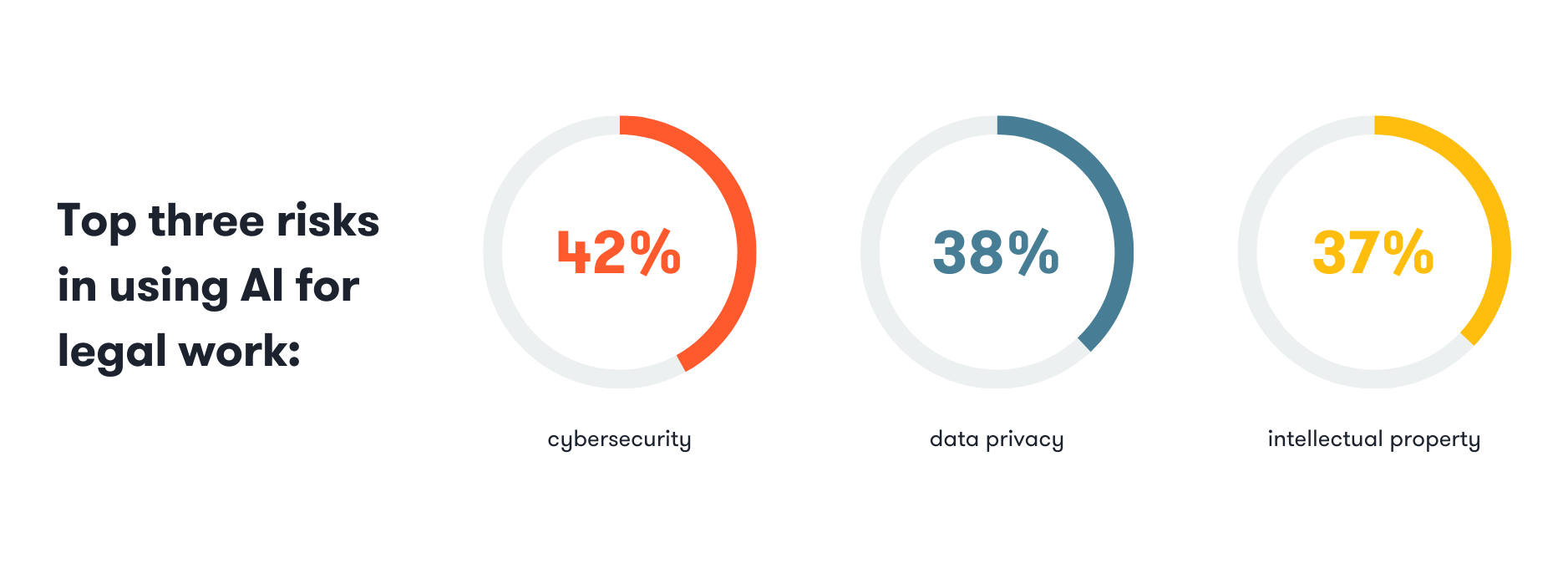 The disconnect between AI adoption and governance raises red flags. Every surveyed lawyer acknowledged risks in using AI for legal work, with cybersecurity (42%), data privacy (38%), and intellectual property concerns (37%) topping the list. For teams using AI frequently, half identified cybersecurity as their primary concern.