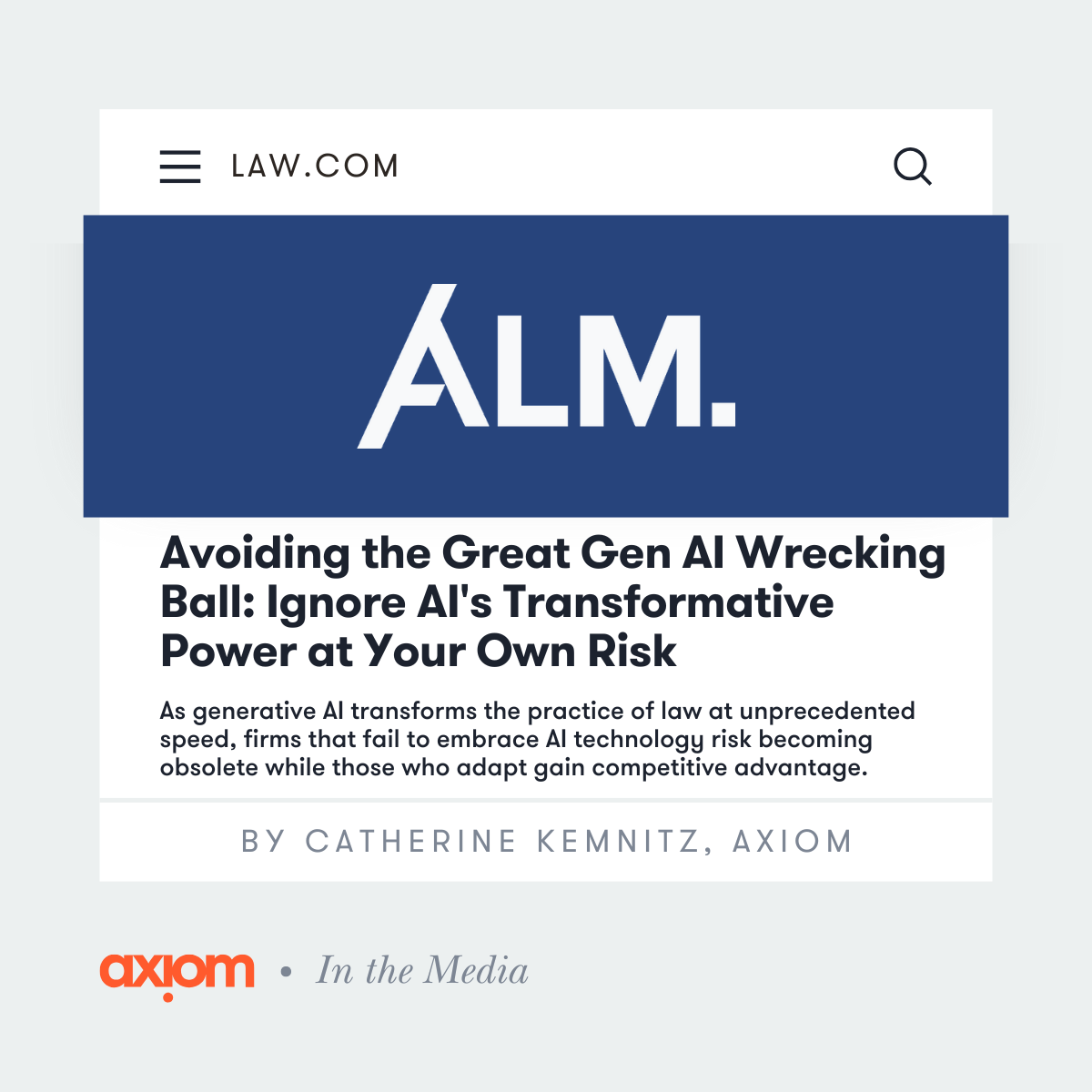 Law.com published an analysis by Axiom's Catherine Kemnitz, warning that generative AI represents a "wrecking ball" creating an existential threat to legal organizations that resist technological transformation. Kemnitz argues that, unlike past legal tech innovations, AI fundamentally reshapes how legal work gets done, with younger lawyers expecting AI-enabled workplaces and efficiency gains of 20-40% already being documented.