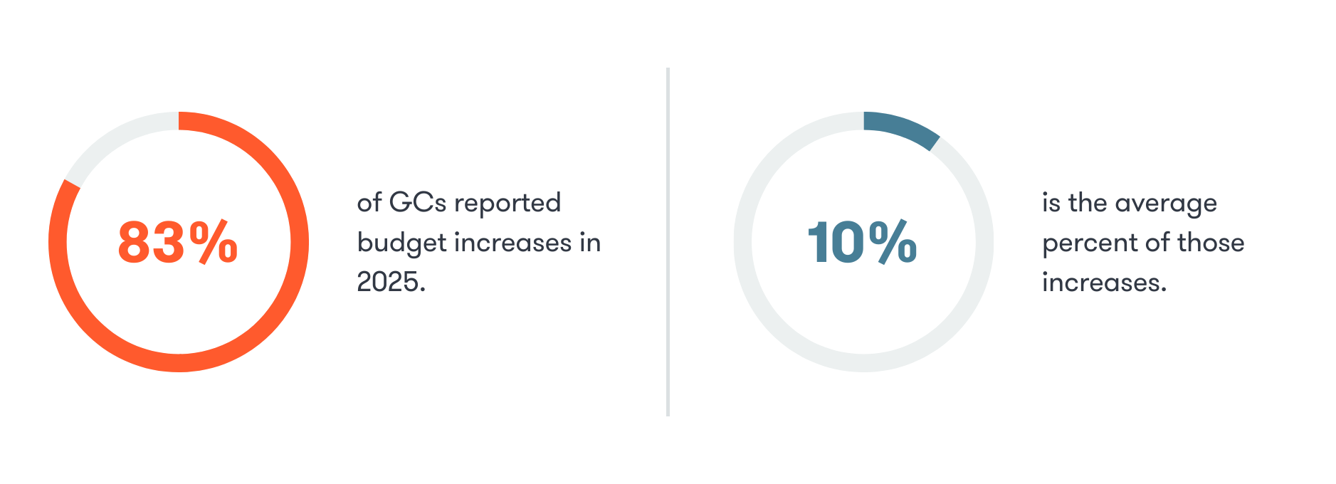 While many corporate functions face budget constraints, our research reveals a compelling countertrend: 83% of GCs reported budget increases, averaging 10%. This isn't just incremental growth—these increases range from 1% to as high as 56%, signaling that organizations increasingly view their legal functions not as cost centers but as crucial risk management partners.