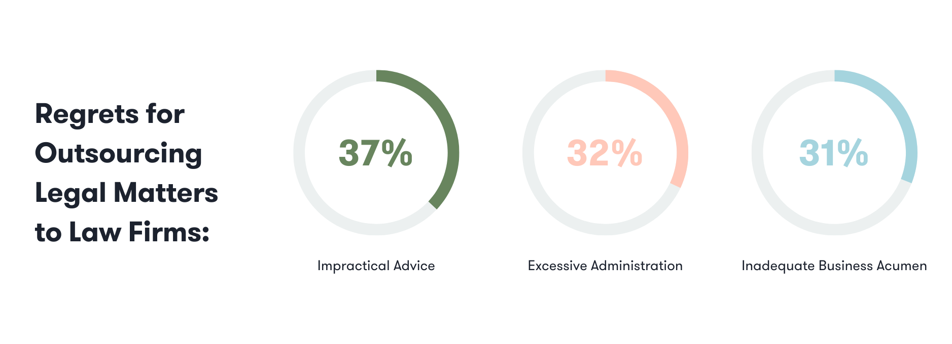 Notably, traditional law firm arrangements face increased scrutiny, with 97% of GCs reporting regrets after outsourcing over a quarter of their legal matters. The main complaints include impractical advice (37%), excessive administration (32%), and inadequate business acumen (31%).