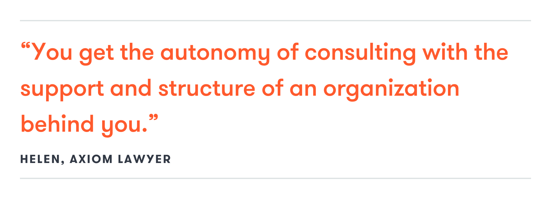 Helen also appreciates how the Axiom model benefits clients: "Clients get highly experienced lawyers who can integrate quickly and start adding value right away. And as lawyers, we get the flexibility to bring our best selves to work."