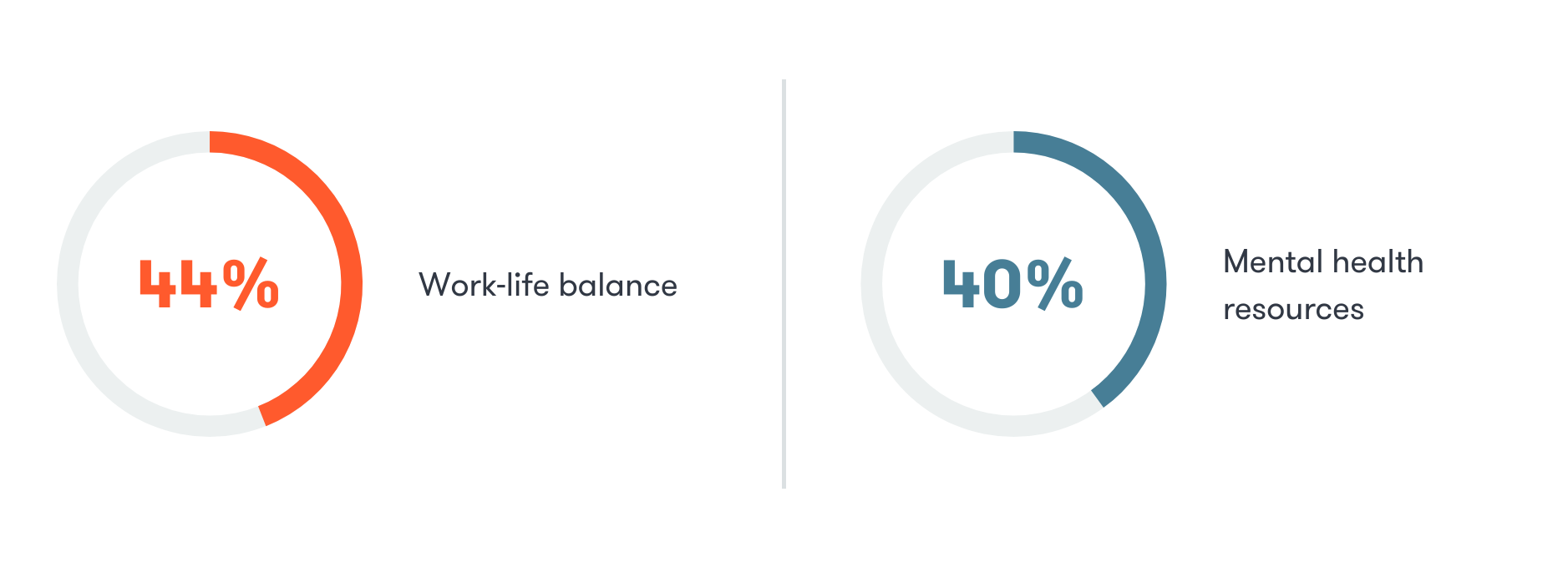 Work-life balance was high on respondents’ lists of priorities, closely followed by mental health resources. “Mental health is an area where I think there's been changes as a result of the pandemic in the workforce and in legal departments,” Dave remarked. “And I think it's a change that's here to stay, which is a recognition that the more individual lawyers—and their law firms and legal departments—invest in mental health, there is far greater productivity, making a more positive workforce.” He believes providing access to mental health resources is a good way for employers, who are looking for good candidates, to differentiate themselves.