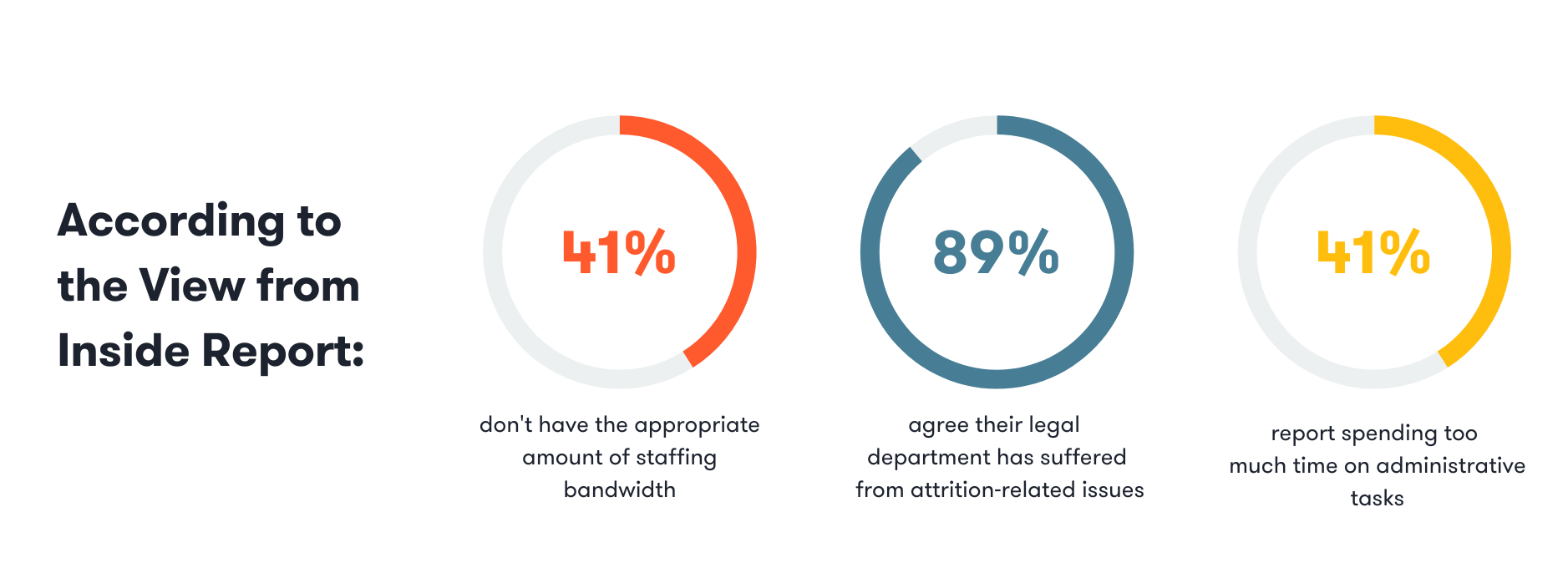 Forty-one percent of respondents report a core problem they’re facing is not having the appropriate amount of staffing bandwidth. On top of that, the overwhelming majority (89%) also agree that their legal department has suffered from attrition-related issues. As a result, 41% report spending too much time on administrative tasks as a core problem preventing their team from getting their work done effectively.