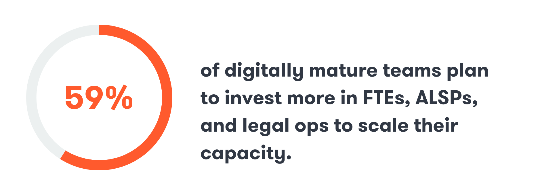 Indeed, 59% of digitally mature teams plan to invest more in FTEs, ALSPs, and legal ops—in that order—to scale their capacity (and hopefully reduce their stress).