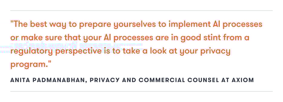 One of the key takeaways from the webinar was the importance of leveraging existing privacy frameworks and policies when drafting AI policies. Padmanabhan advised, "The best way to prepare yourselves to implement AI processes or make sure that your AI processes are in good stint from a regulatory perspective is to take a look at your privacy program."