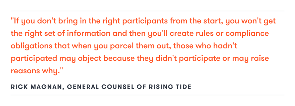 Magnan doesn’t believe that the adaptation of the company’s business standards should be assigned to just the risk department, legal department, or business units. GCs need to gather information that they’re going to use to establish company policies and compliance requirements. After all, it’s what makes them cross-functional. So, Magnan argues it’s important to bring in the right participants from the start: “If you don't, you won't get the right set of information and then you'll create rules or compliance obligations that when you parcel them out, those who hadn't participated may object because they didn't participate or may raise reasons why.”