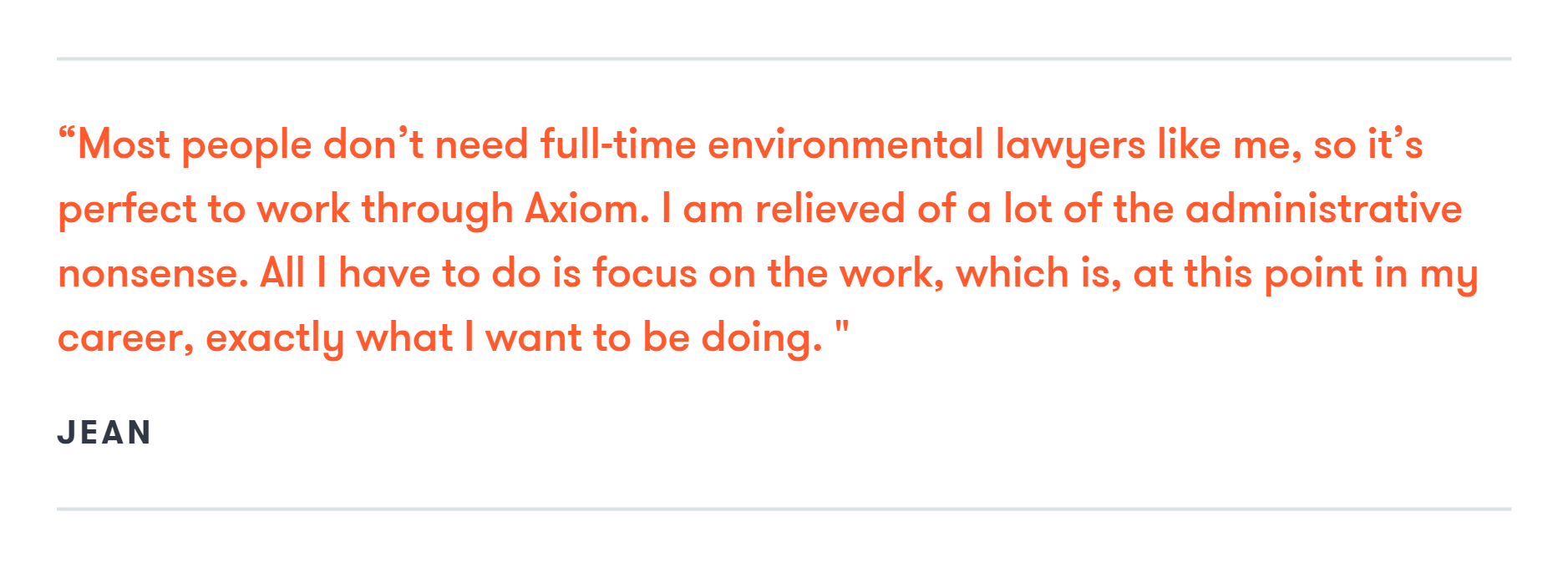 Axiom’s engagement model has permitted Jean to bring her expertise to many different clients, while enabling her to focus squarely on just the legal side of her work. “Most people don’t need full-time environmental lawyers like me, so it’s perfect to work through Axiom," Jean says. "I am relieved of a lot of the administrative nonsense. All I have to do is focus on the work, which is, at this point in my career, exactly what I want to be doing.”