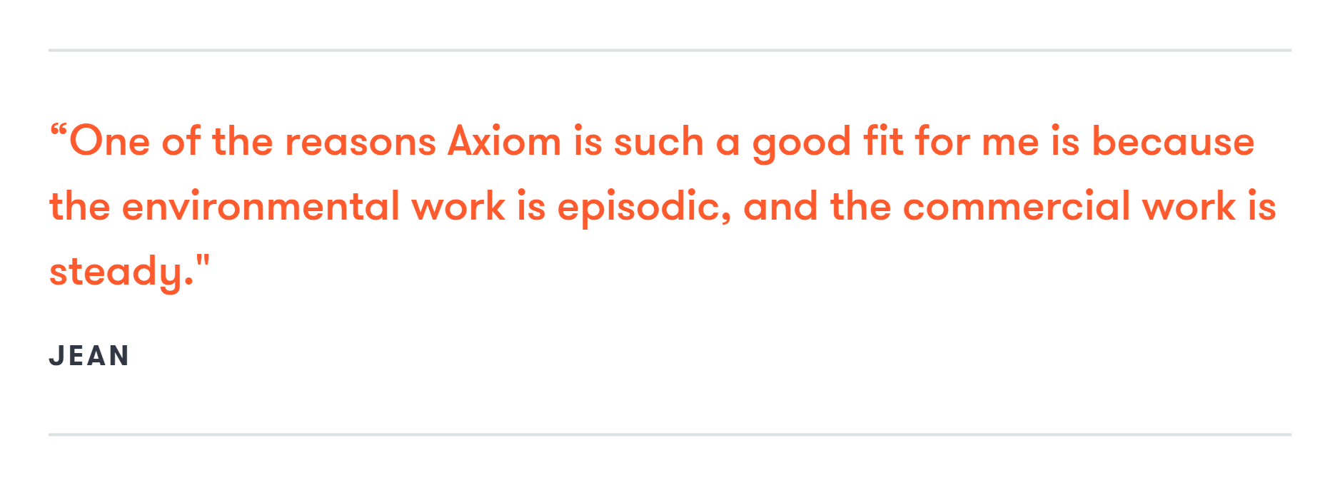 Jean enjoys working with many different clients on many different types of projects: “One of the reasons Axiom is such a good fit for me is because the environmental work is episodic, and the commercial work is steady. Some of my old engagements call me twice a year for specific types of liability questions on the environmental side. I always have something interesting to do, but I’m not always swamped. And my workload isn’t always too light, either.”