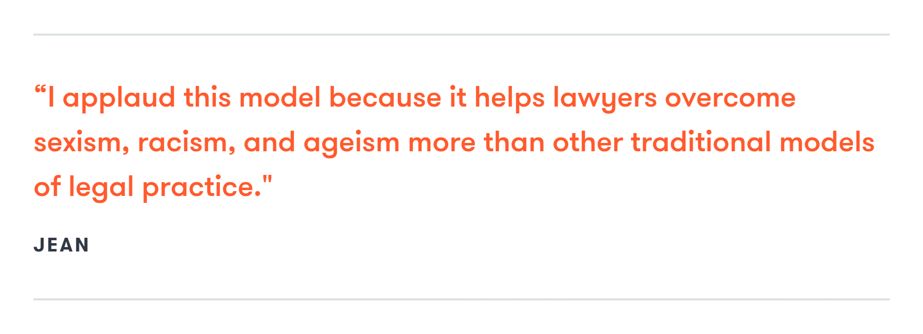 Jean believes that “true thought leaders recognize that failing to nurture talented individuals because they may not have been selected by central casting leads to stymied careers and a great waste of talent.” Jean knows that Axiom's model helps legal talent break barriers by offering a diverse group of lawyers who are vetted for their experience and courted by corporate law departments as important contributors. “I applaud this model because it helps lawyers overcome sexism, racism, and ageism more than other traditional models of legal practice.”