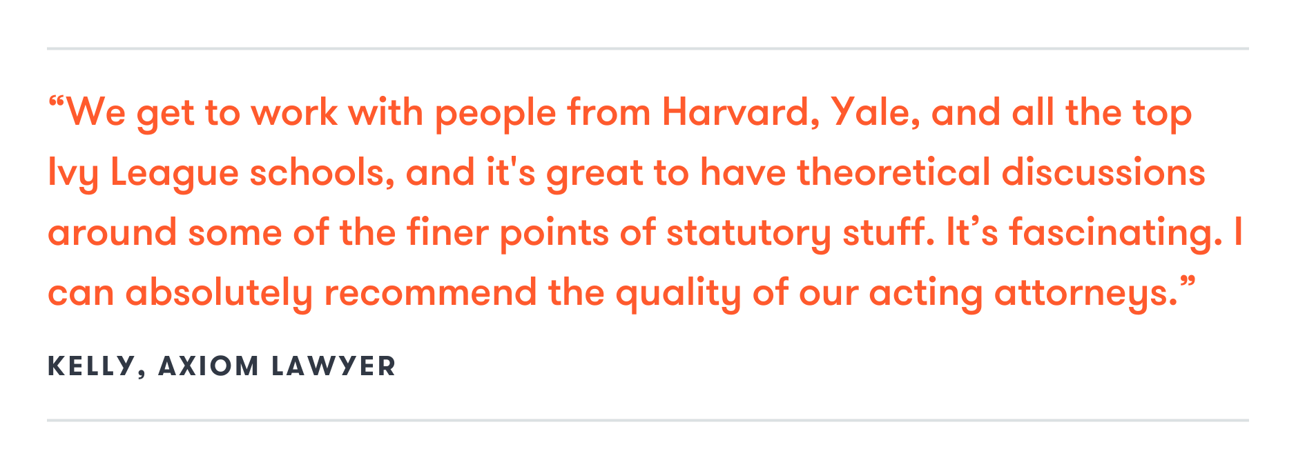 “We get to work with people from Harvard, Yale, and all the top Ivy League schools, and it's great to have theoretical discussions around some of the finer points of statutory stuff. It’s fascinating. I can absolutely recommend the quality of our acting attorneys,” Kelly elaborates. Other corporate counsels and legal teams agree - Axiom recently announced results from its latest talent quality survey, which reflects detailed feedback from thousands of clients across 31 industries and 14 practice areas. Axiom’s lawyers achieved an industry-leading Net Promoter® Score (NPS®) of 68, compared to the legal services average of 37, positioning Axiom’s talent in the high end of the “excellent” category.