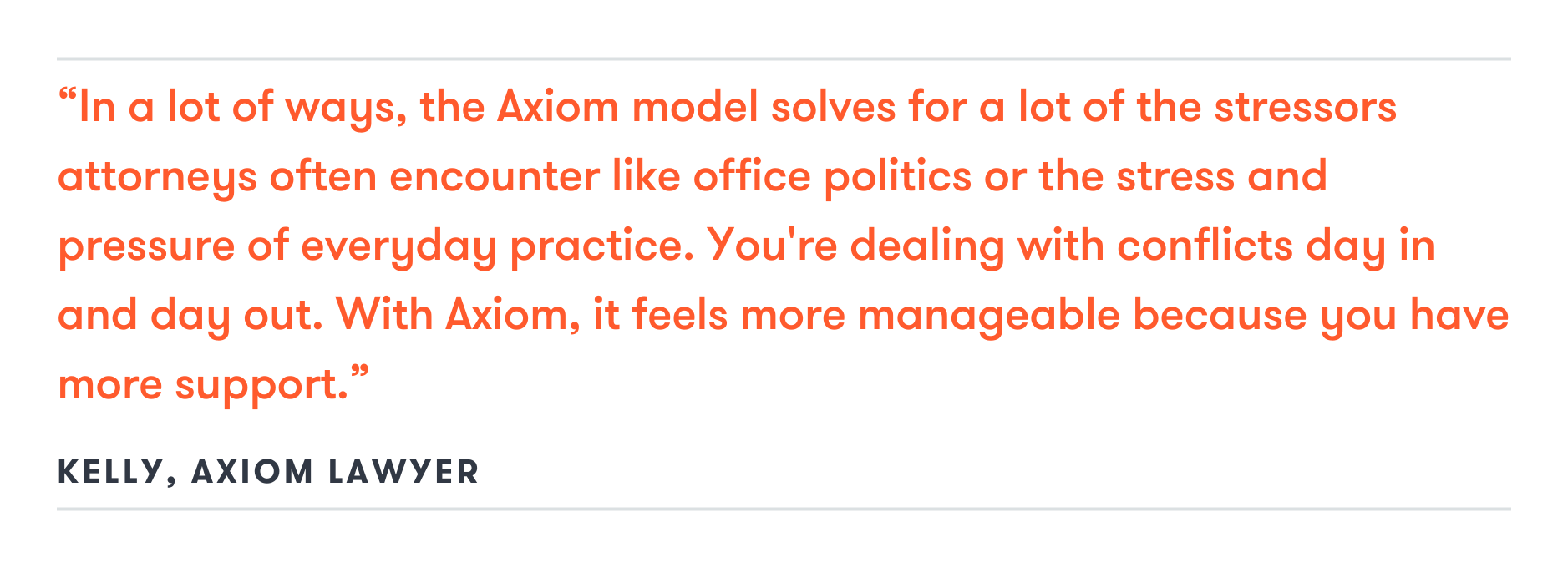 Axiom can help lawyers find the key to the intricate work-life balance puzzle because, as Kelly describes, “In a lot of ways, the Axiom model solves for a lot of the stressors attorneys often encounter like office politics or the stress and pressure of everyday practice. It's a lot. You're dealing with conflicts day in and day out,” she details.