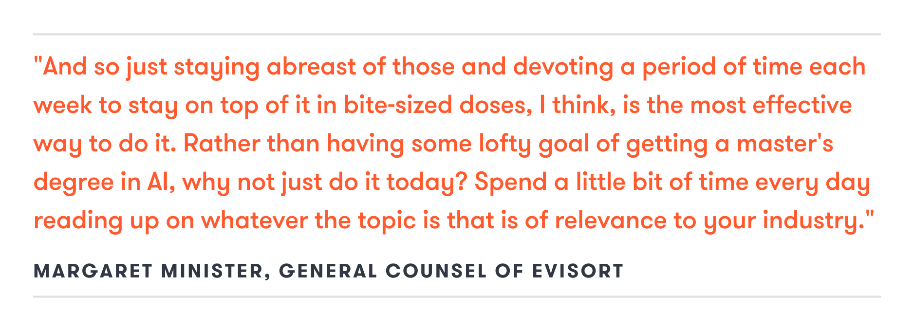 Panelists understood the many demands on a GC's time and suggested consuming relevant materials in consistent, bite-sized chunks. Margaret Minister explained: "And so just staying abreast of those and devoting a period of time each week to stay on top of it in bite-sized doses, I think, is the most effective way to do it. Rather than having some lofty goal of getting a master's degree in AI, why not just do it today? Spend a little bit of time every day reading up on whatever the topic is that is of relevance to your industry."