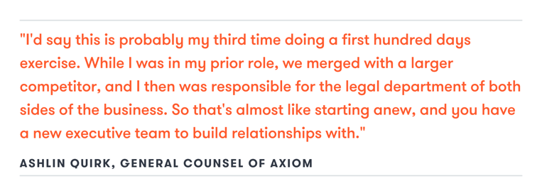 Change, of course, does not stop after the first 100 days as a GC. However, a new General Counsel's first 100 days are particularly laden with change for the GC and the organization. As Ashlin Quirk explained, even experienced GCs feel like they are starting anew when they start a new GC role: "I'd say this is probably my third time doing a first hundred days exercise. While I was in my prior role, we merged with a larger competitor, and I then was responsible for the legal department of both sides of the business. So that's almost like starting anew, and you have a new executive team to build relationships with."
