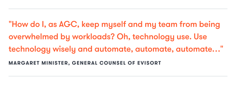 During the webinar, Margaret Minister highlighted the time-saving benefits of technology automation: "How do I, as AGC, keep myself and my team from being overwhelmed by workloads? Oh, technology use. Use technology wisely and automate, automate, automate…"