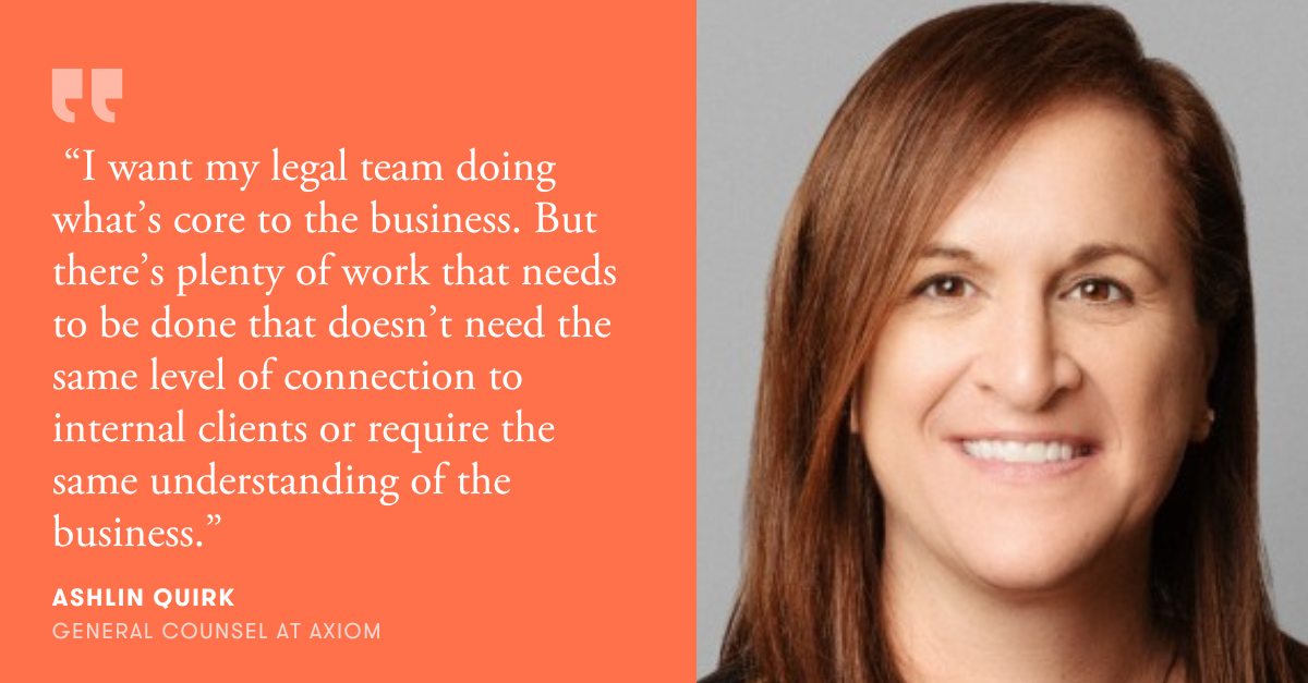 As Quirk added, “I want my legal team doing what’s core to the business. But there’s plenty of work that needs to be done that doesn’t need the same level of connection to internal clients or require the same understanding of the business.”
