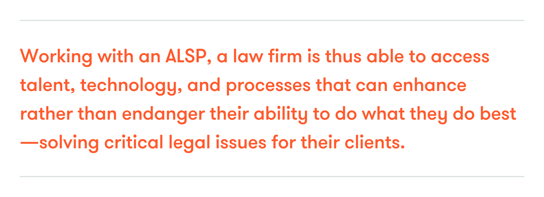 Working with an ALSP, a law firm is thus able to access talent, technology, and processes that can enhance rather than endanger their ability to do what they do best—solving critical legal issues for their clients.