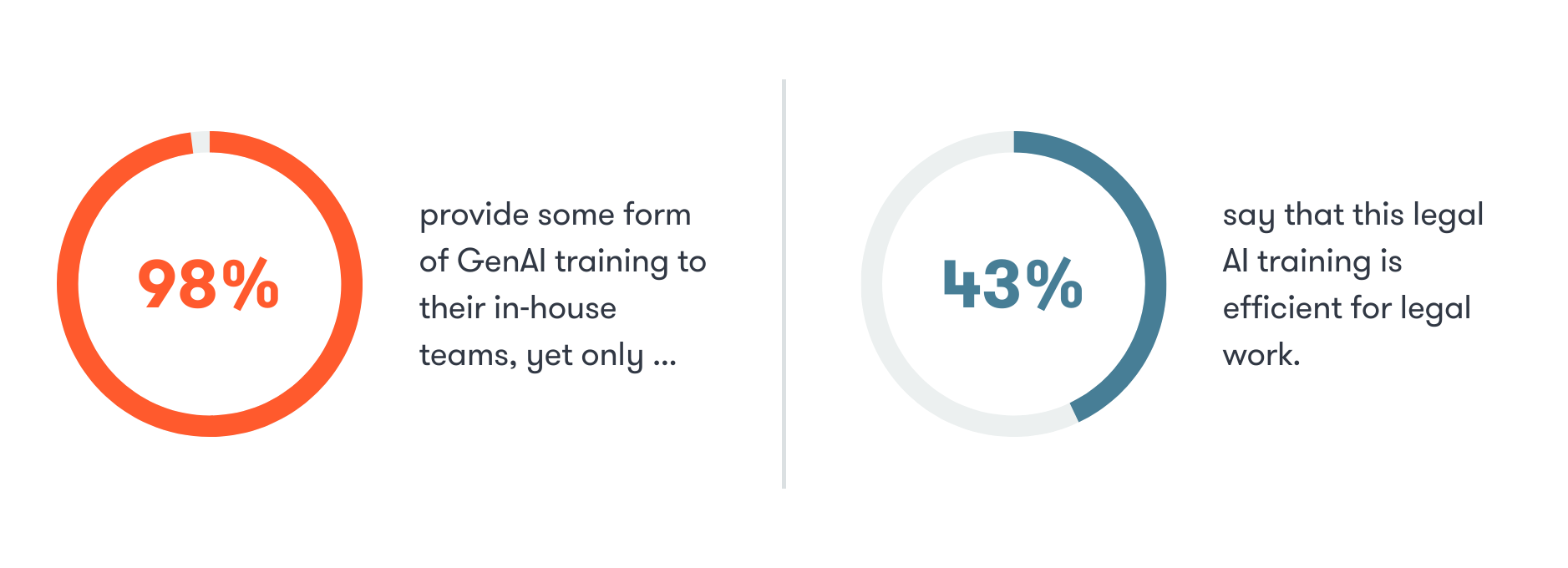 The survey reveals a troubling paradox in AI training for legal work. While nearly all legal departments (98%) provide some form of legal AI training, less than half (43%) believe their training effectively prepares teams for legal work. This gap between training provision and effectiveness suggests a need for more targeted, specialized approaches to GenAI education in legal contexts.