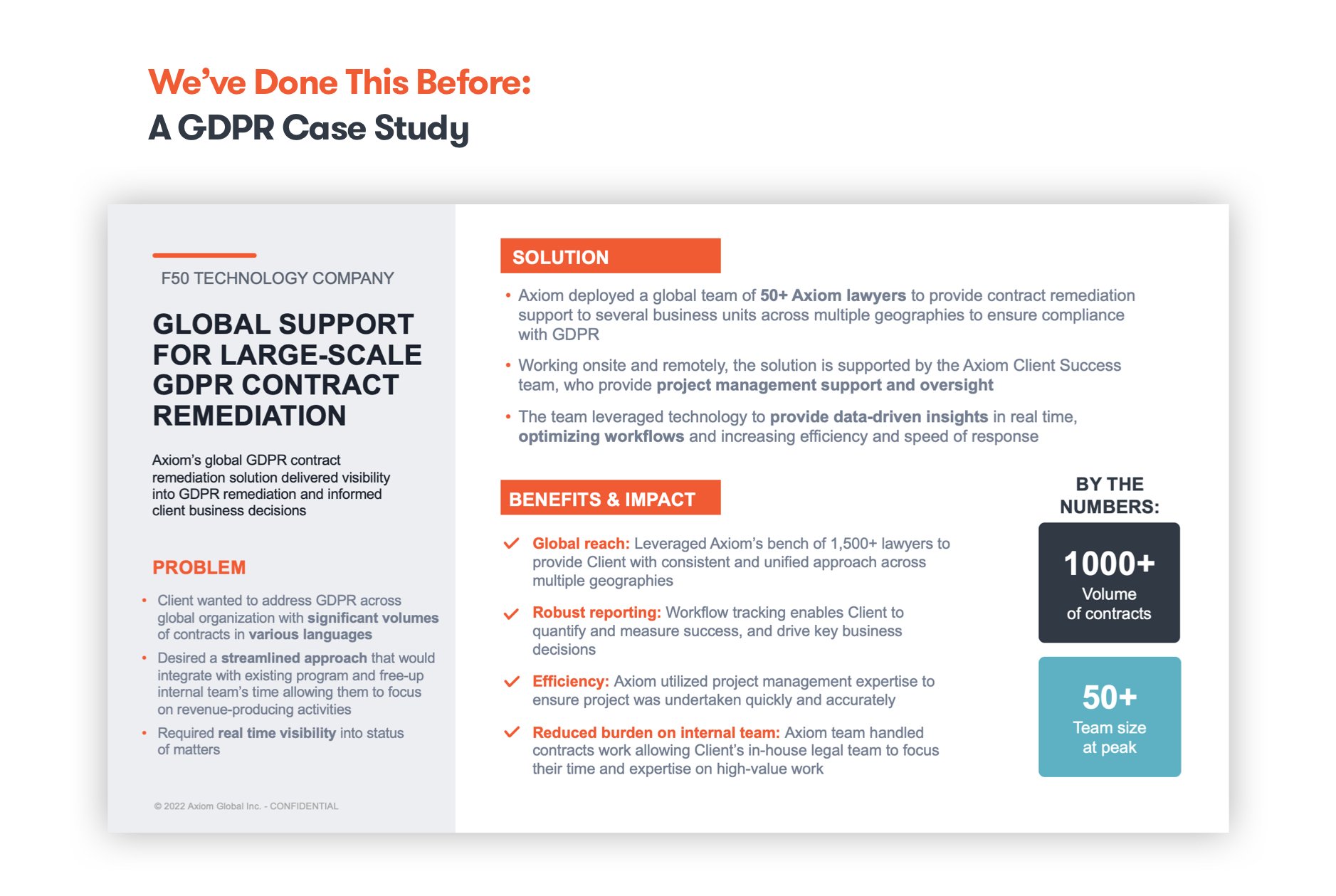 Axiom’s structured team approach to SCC GDPR updates enables companies to engage a coordinated team of flexible, privacy lawyers and legal professionals, led by an experienced manager.: The team will review and update contracts as efficiently and cost-effectively as possible, streamlining communication and work allocation through a client privacy contact and Axiom privacy professionals while providing clients with the option of technology-driven metrics and reporting to track progress against goals.