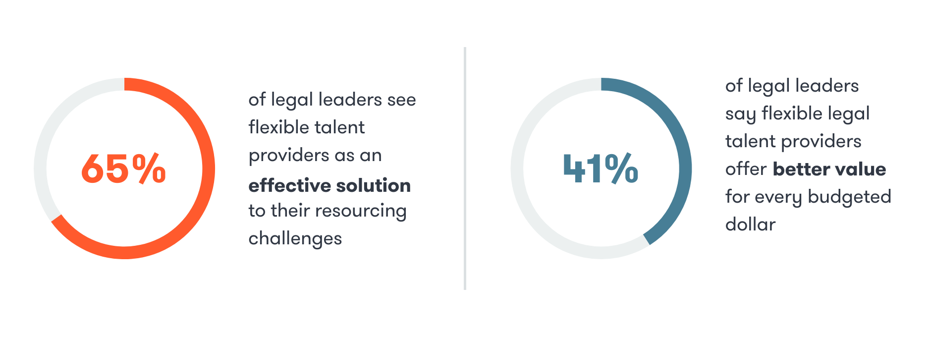 Conversely, nearly two-thirds of legal leaders (65%) see flexible talent providers as a particularly effective solution to their department’s resourcing challenges. In an era of shrinking budgets and rising law firm rates, almost half (41%) say flexible talent providers offer better value for every budgeted dollar.