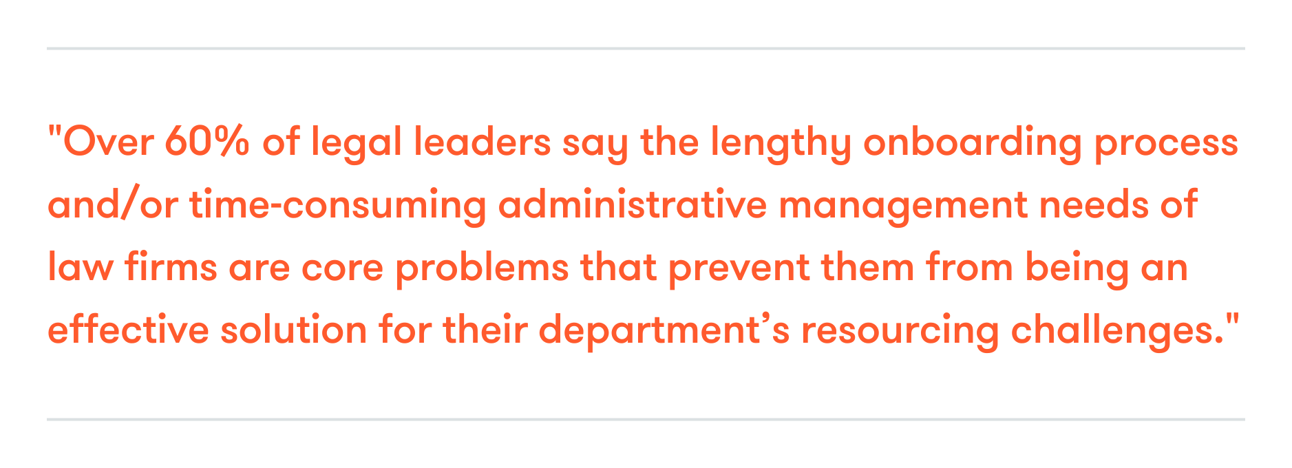 Importantly, though, legal leaders are finding law firms to be a particularly ineffective tool for the challenges they’re currently facing. While law firms may have once been the go-to resource for legal departments needing extra help, fewer than half of legal leaders (47%) say they are an effective solution for the problems they’re currently facing. Why? Law firms lack commercial acumen and insight into the nitty-gritty work they need to get done. Nearly two in five (42%) say law firms provide conceptual advice rather than the practical advice their departments need.