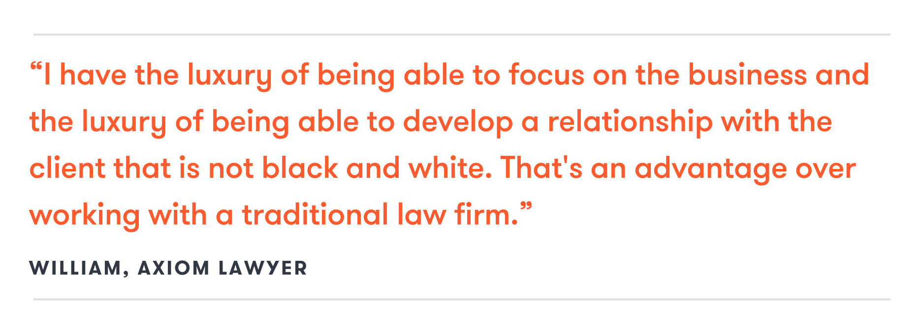 The layoff didn’t discourage William from the legal industry either. After William learned he had been laid off, one of his colleagues suggested he reach out to a friend who was working through Axiom and only had positive things to share.