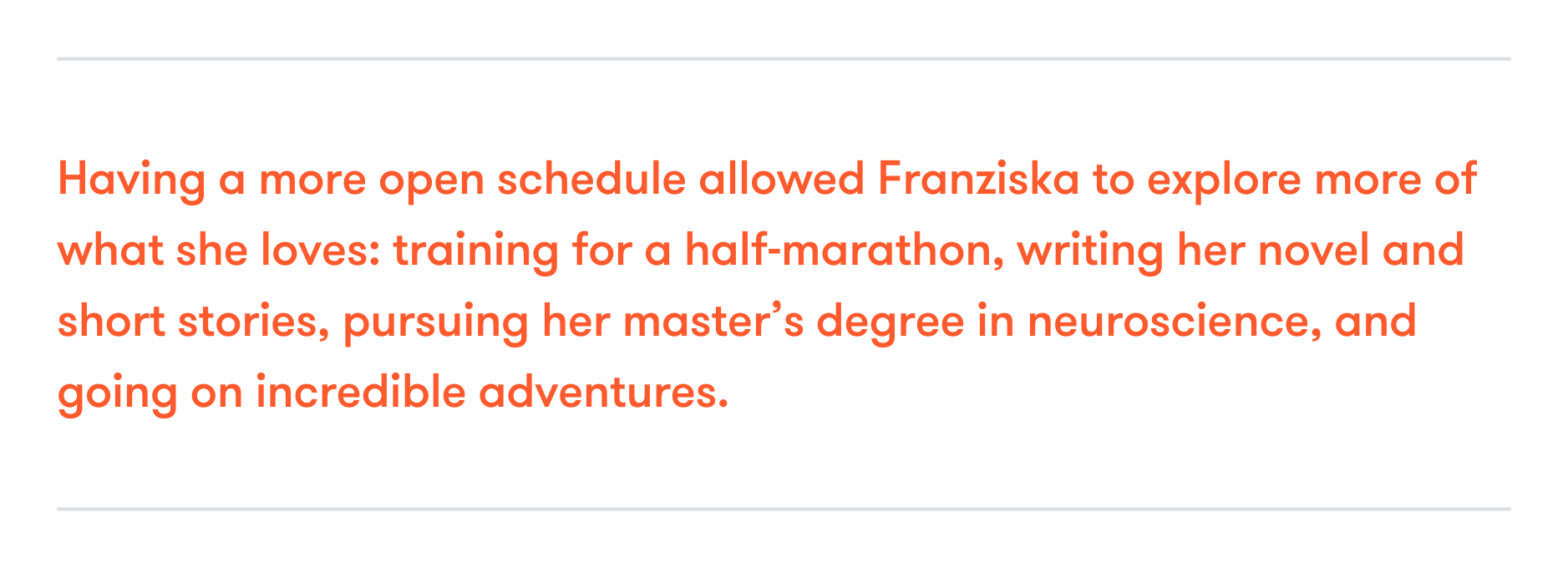 Soon after joining Axiom, she transitioned seamlessly into her first few engagements part-time. Having a more open schedule allowed her to explore more of what she loves: training for a half-marathon, writing her novel and short stories, pursuing her master’s degree in neuroscience, and going on incredible adventures. She ramped up her workload to full-time when she was ready for more challenges and larger engagements, and then transitioned back to part-time when she wanted to focus on her interests once again.