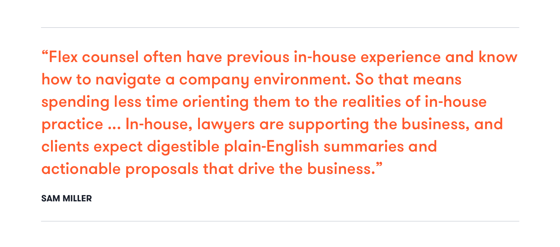 I was also looking for an accelerated ramp time. Flex counsel often have previous in-house experience, and know-how to navigate a company environment. So that means spending less time orienting them to the realities of in-house practice and how it differs from being in a firm where the lawyers and the practice of law are the business. In-house, lawyers are supporting the business, and clients expect digestible plain-English summaries and actionable proposals that drive the business. That requires not just a solid understanding of the company and its priorities, but an ability to build trust and rapport with your business partners, as well as a capacity for quickly absorbing and synthesizing large amounts of information.