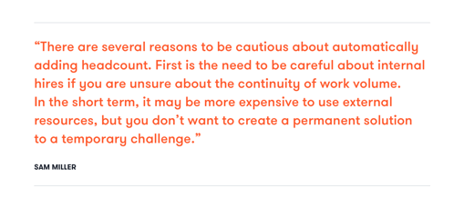 There are several reasons to be cautious about automatically adding headcount. First is the need to be careful about internal hires if you are unsure about the continuity of work volume. In the short term, it may be more expensive to use external resources, but you don’t want to create a permanent solution to a temporary challenge. For example, if the company is standing up a new business line, it can be a good opportunity to work with flexible talent. You may need additional people to set it up – working on privacy, compliance, commercial structure, sample agreements, etc. – but if the post-setup workload is going to be lower, bringing in permanent headcount can be risky. Even if ultimately hiring internally, starting with flex lawyers gives you more time to evaluate what skill set and level of seniority you need.