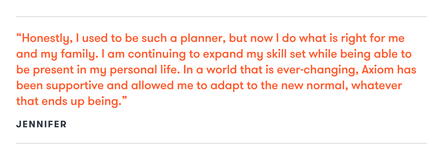 While a different path led her to Axiom, Kate shares the same sentiments as Marcia. Like many others in the U.S. workforce, Kate was laid off due to the COVID-19 pandemic in July 2020. While stressful, this time also offered her the ability to reflect on what was important to her. To continue bringing in income to help support her family, she began her own consulting practice, where she realized she enjoyed being independent but knew she needed to find flexible work beyond just consulting.
