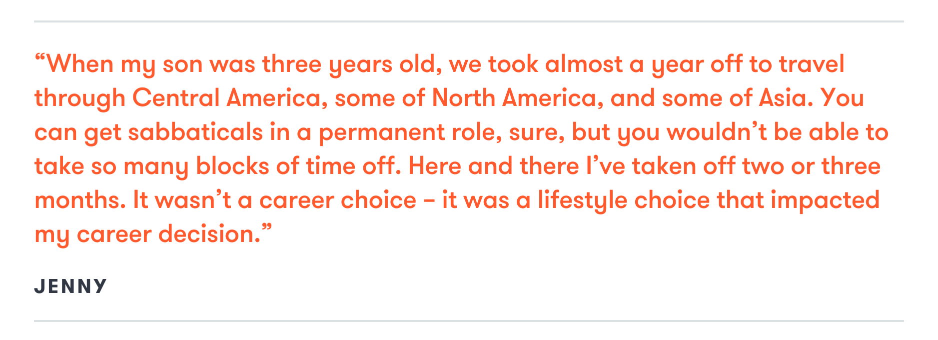 Jenny, a commercial, contracts, and data privacy lawyer with law firm and in-house experience, chooses Axiom again and again due to its flexibility for her family. “When my son was three years old, we took almost a year off to travel through Central America, some of North America, and some of Asia. You can get sabbaticals in a permanent role, sure, but you wouldn’t be able to take so many blocks of time off. Here and there I’ve taken off two or three months. It wasn’t a career choice – it was a lifestyle choice that impacted my career decision.” Jenny has found Axiom offers her the perfect balance: allowing her to fulfill her passion for providing high-caliber legal services while also spending quality moments with her family.