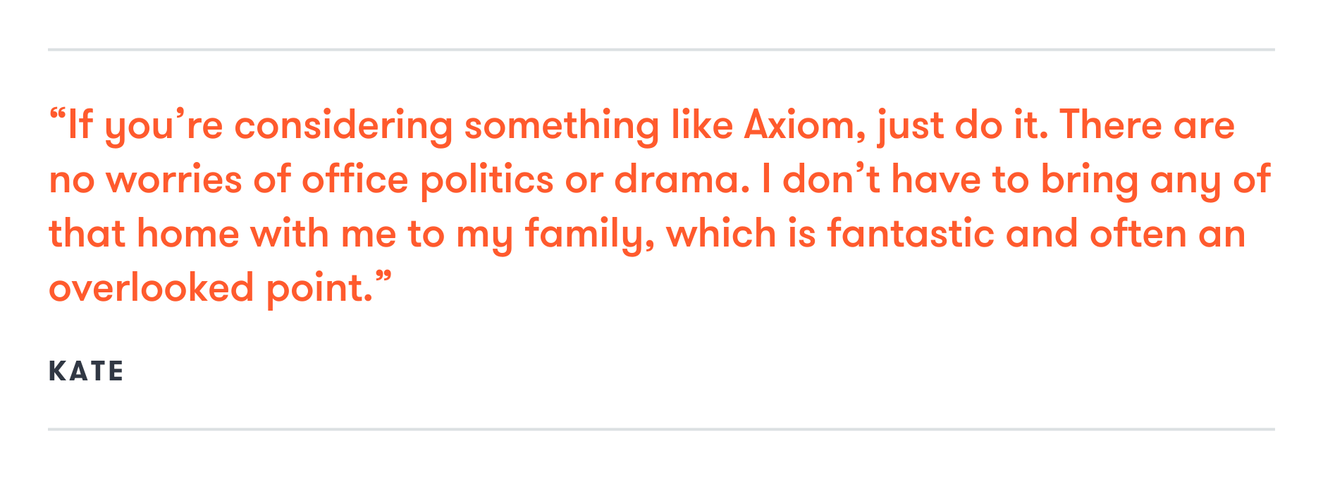 Kate encourages other ambitious working parents to break the constraints of a toxic workplace or the stress of not feeling valued. “If you’re considering something like Axiom, just do it. There are no worries of office politics or drama. I don’t have to bring any of that home with me to my family, which is fantastic and often an overlooked point.”