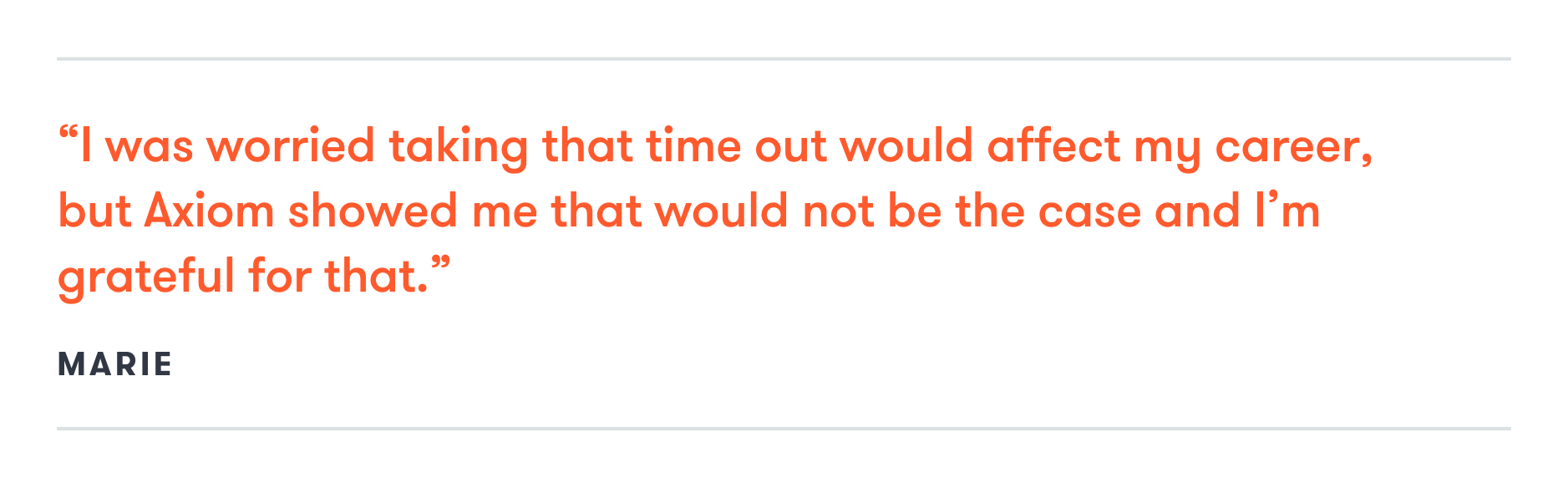 “If I had gone to a company that wasn’t like Axiom, they would probably have put me in a dreadful, non-dynamic box, where I was bored out of my brains because I took time out. Not only did they not do that, but they also gave me a choice – they said here are three great opportunities and see which one you want.”