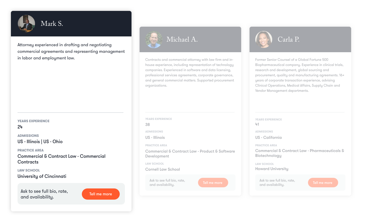 You can narrow your search by applying filters for location, availability, and experience. Once you find the right contract attorney for your needs, you can start a conversation or book them directly.