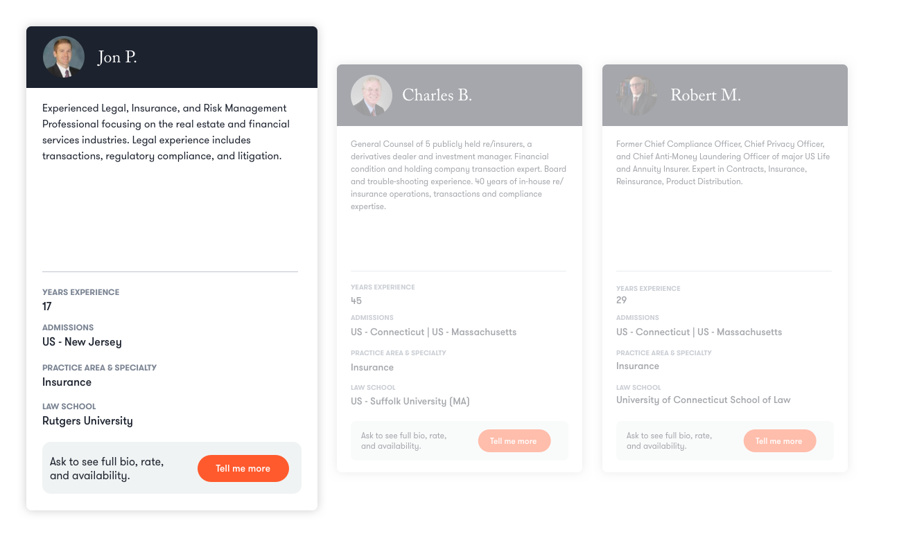 You can narrow your search by applying filters for location, availability, and experience. Once you find the right insurance attorney for your needs, you can start a conversation or book them directly.