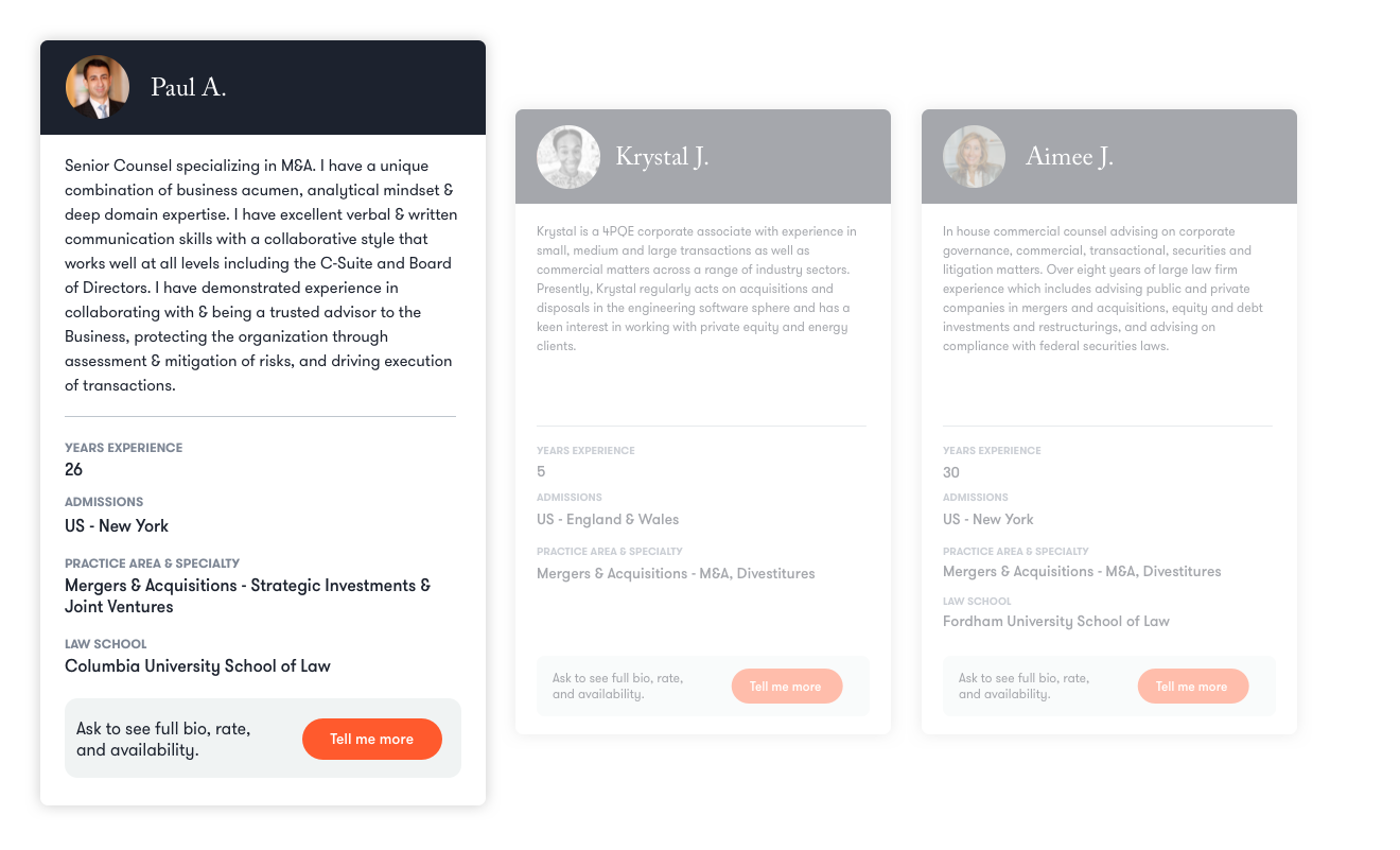 Axiom makes it easy to find M&A lawyers in your area. Find the lawyers and legal staff you need with Axiom’s Talent Finder. Browse through our network of legal professionals with deep experience in mergers and acquisitions. You can narrow your search by applying filters for location, availability, and experience. Once you find the right M&A attorney for your needs, you can start a conversation or book them directly.