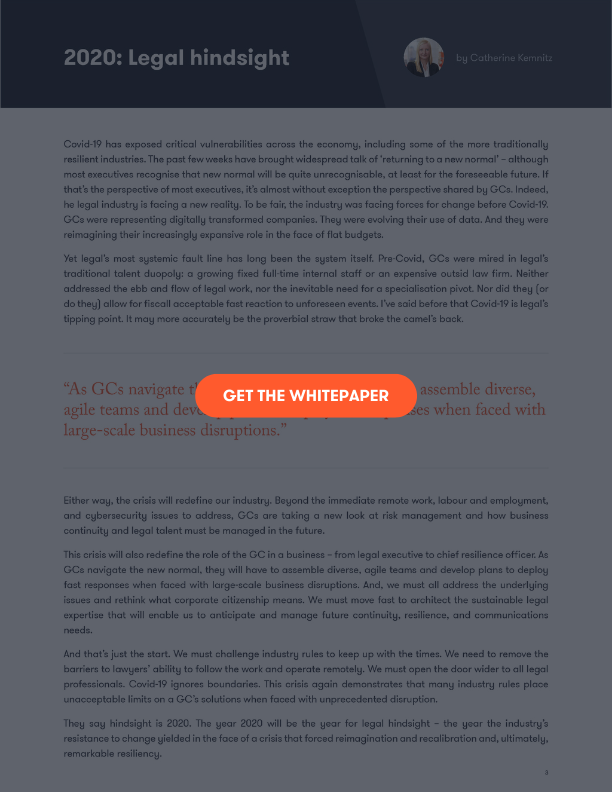 2020 was (and is) the year the industry’s resistance to change yielded in the face of a crisis that forced a reevaluation. The year that made GCs rethink how they use and deploy talent. The year that a societal reckoning pushed GCs to embrace their role – not only as reputational guardians of their companies – but as drivers of change.